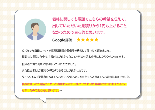 そのおかげで、実際にご依頼をいただいた際もご家族間でイメージを共有できており、打ち合わせから当日まで落ち着いて準備を進めることができました。