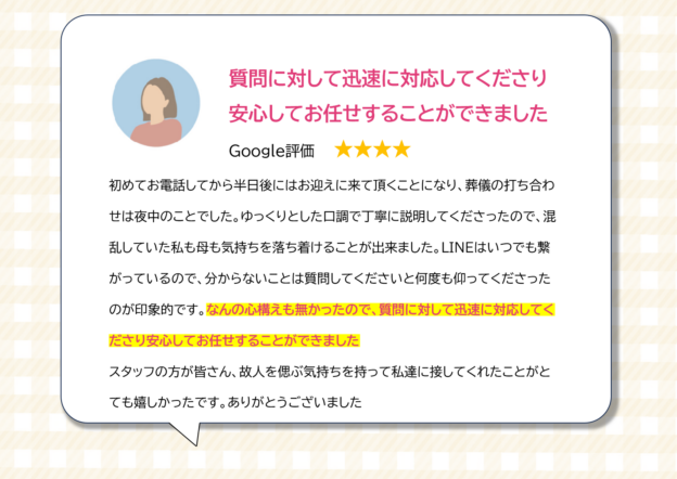 お電話から迅速に対応できたことについて、お褒めのお言葉をいただき、ありがとうございます。また、お打ち合わせについても「気持ちを落ち着けることが出来た」と温かなお気持ちをいただき、スタッフ一同安堵いたしております。